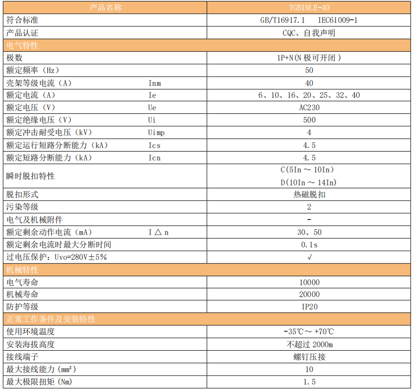 TGB1NLE-40剩余电流动作断路器